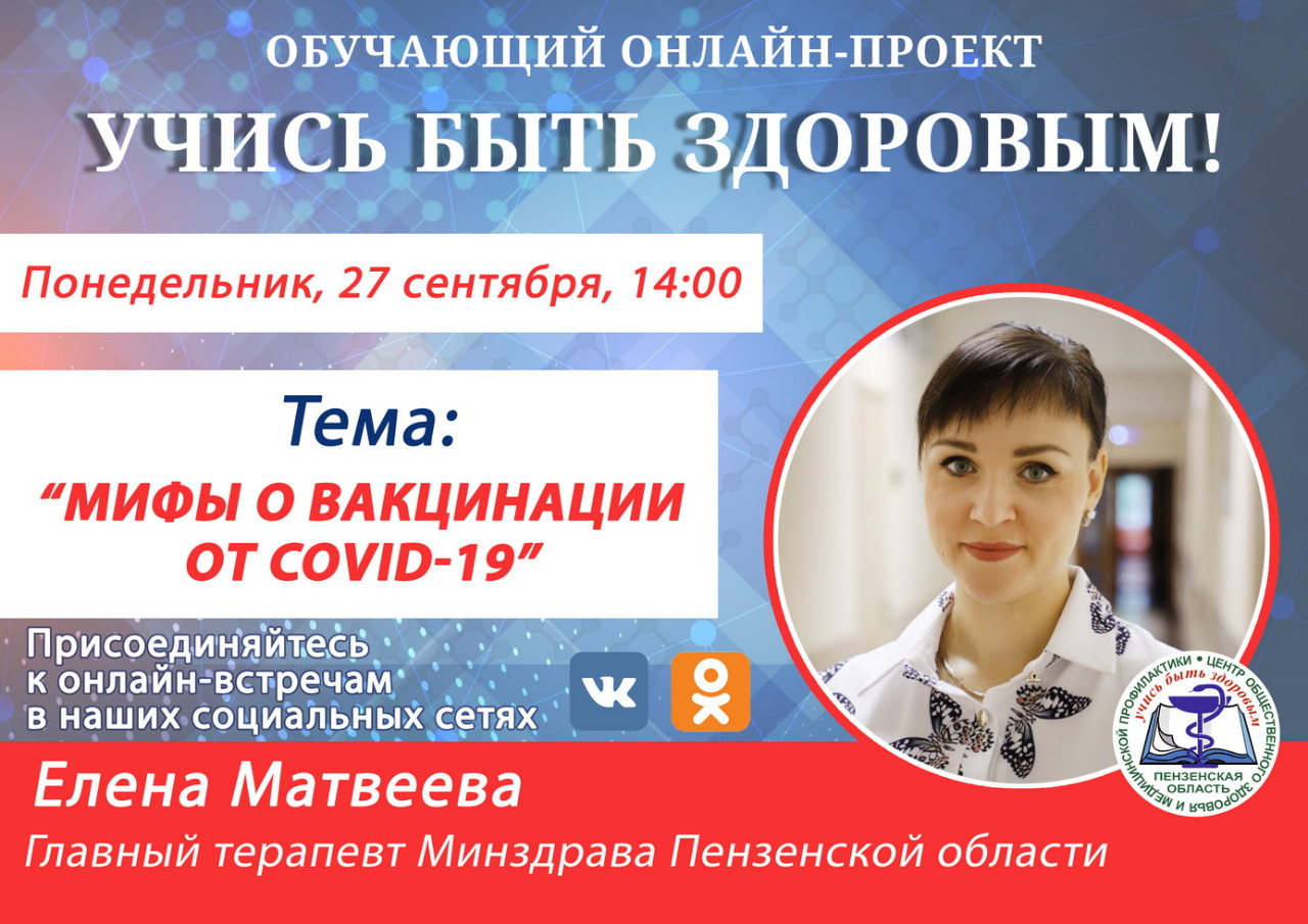 На эти и другие вопросы жители Пензенской области смогут получить ответы в рамках он-лайн эфира, который состоится в понедельник, 27 сентября, в 14:00 часов в аккаунтах социальных сетей Пензенского областного центра общественного здоровья и медицинской профилактики.