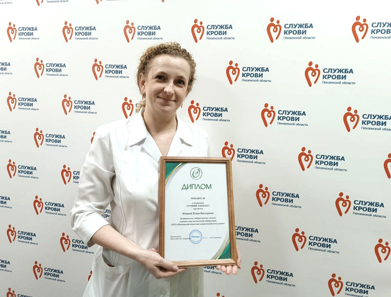 Медицинский лабораторный техник клинико-диагностической лаборатории Пензенского областного клинического центра крови Юлия Юдина стала победителем регионального этапа Всероссийского конкурса «Лучший специалист со средним медицинским и фармацевтическим образованием» в номинации «Лучший лаборант». Приобретенные за 18 лет знания и опыт Юлии Викторовны, позволили ей проявить все лучшие качества специалиста среднего звена лабораторной службы, обеспечивая качественное профессиональное выполнение своих обязанностей для обеспечения иммуногематологической безопасности гемотрансфузий.