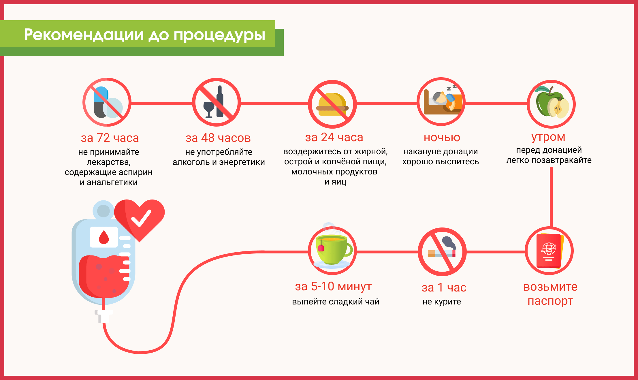 Соблюдение донором правил питания позволит заготовить качественные и безопасные гемокомпоненты для клинического использования и поможет донору нормализовать самочувствие до и после процедуры сдачи крови.